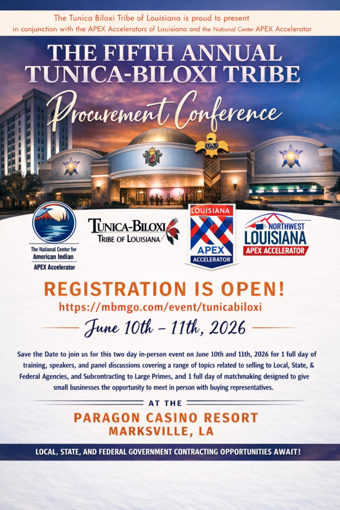 Upcoming Events April 2026 22 Apr Strengthening the Defense Industrial Base Wednesday EVENT DETAIL May 2026 07 May From Paper to Profit! Learn how to create a powerful capability statement that sets your business apart! Thursday EVENT DETAIL 21 May SBA Series: WOSB & EDWOSB Thursday EVENT DETAIL 28 May Structure Matters: Choosing the Right Partnership Strategy in Government Contracting Thursday EVENT DETAIL June 2026 09 Jun SBA Series: 8(a), VOSB, and Federal Surplus Programs Tuesday EVENT DETAIL 10 - 11 Jun The Fifth Annual Tunica-Biloxi Tribe Procurement Conference Wednesday EVENT DETAIL No event found! Date Jun 10 - 11 2026 Time All Day The Fifth Annual Tunica-Biloxi Tribe Procurement Conference Share this event + Add to Google Calendar + iCal / Outlook export